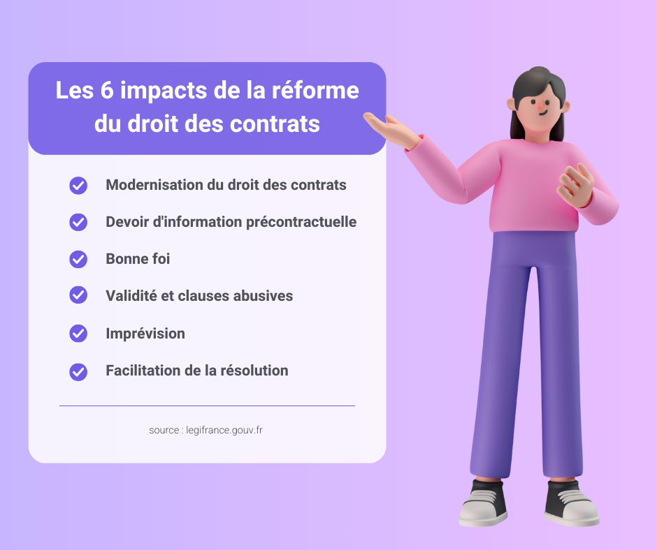 - Modernisation du droit des contrats : Mise à jour du cadre juridique pour le rendre plus adapté aux pratiques modernes.
